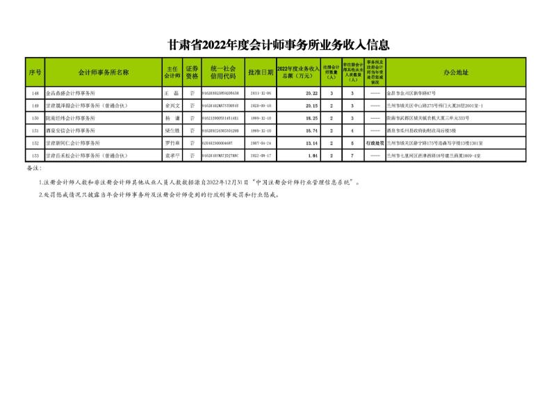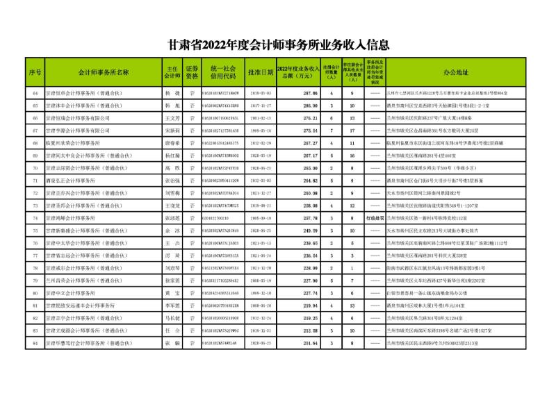 根據(jù)《甘肅省會計師事務(wù)所年度業(yè)務(wù)收入信息發(fā)布辦法》(甘會協(xié)[2021]10號),現(xiàn)將甘肅省2022年度會計師事務(wù)所業(yè)務(wù)收入信息予以發(fā)布